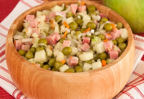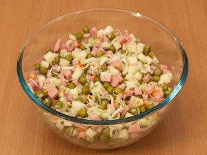 Étape 4 Mélanger tous les ingrédients préparés: choucroute, jambon, poireau, pomme, pois verts et assaisonner la salade avec de l'huile végétale.