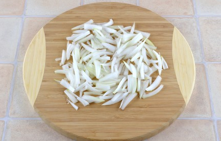 Étape 3 Oignon coupé en demi-anneaux, puis demi-anneaux en deux.