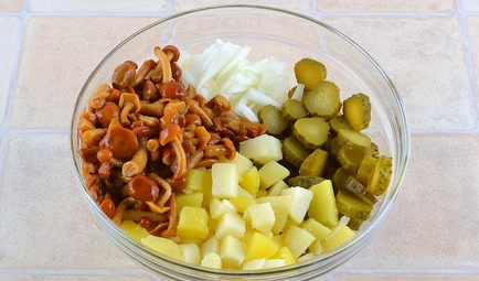 Étape 5 Mettez les pommes de terre, les champignons, les concombres, les oignons dans un saladier. Verser avec de l'huile végétale, mélanger, saler si nécessaire.