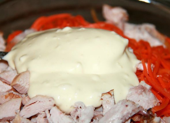 Étape 3 Mélanger le contenu de la plaque de sorte que le remplissage se disperse uniformément. Salade de poulet et carottes fumée à la coréenne.