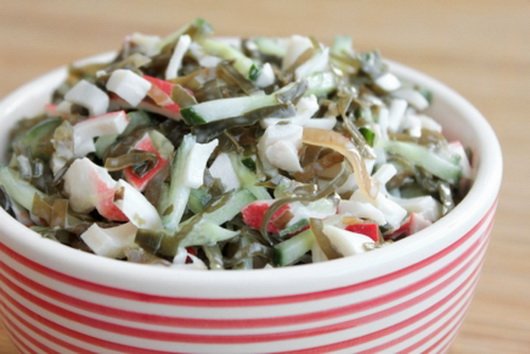 Étape 5 Mélangez des bâtonnets de crabe, des algues, de la laitue et des œufs. Assaisonner la salade avec de la mayonnaise et mélanger.