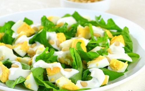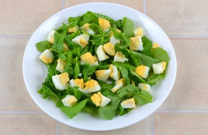 Étape 3 Sur le plat, déposez les feuilles de roquette sur les morceaux d'œuf.