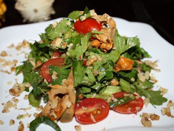 Étape 6 Mélanger: céleri, champignons, tomates et verser avec de l'huile végétale, du sel et du poivre au goût. Saupoudrer la salade finie avec du persil et des noix hachées.