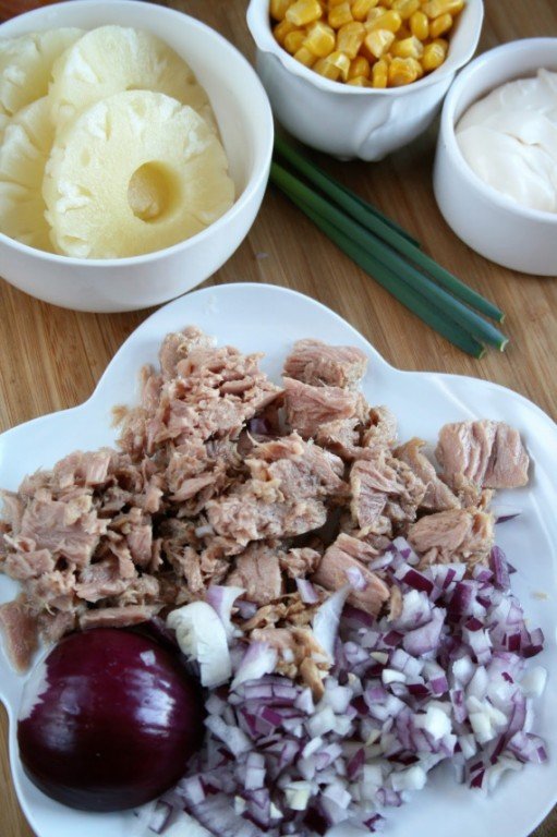 Étape 2 Hacher finement le vert. Ananas coupés en cubes de taille moyenne. Mélanger le thon, les oignons entiers, le maïs et l'ananas dans un saladier profond, le sel, le poivre, un film protecteur ou une pellicule protectrice, et mettre au réfrigérateur pendant 1-2 heures. Ensuite, tous les arômes de la salade sont mélangés, combinés et refroidis, ce qui rendra le plat encore plus savoureux.