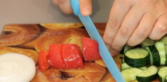 Étape 5 Mettez la laitue lavée sur une assiette et recouvrez de concombres hachés, de tomates.