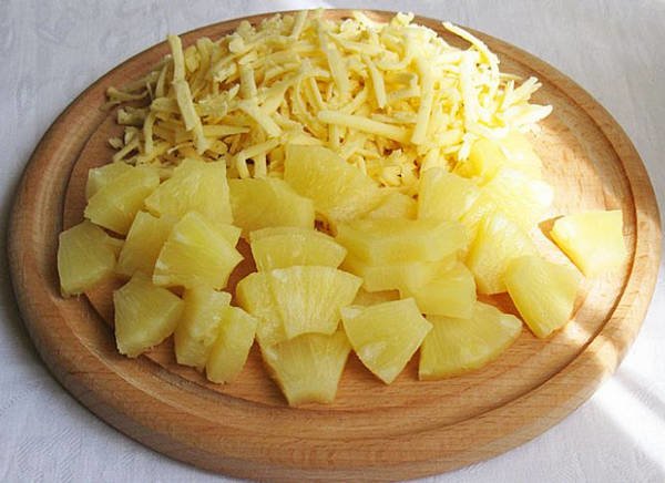 Étape 5 Mélangez tous les ingrédients - fromage, poulet, laitue et ananas. Si vous le souhaitez, vous pouvez ajouter plusieurs raisins. Assaisonner la salade avec de la mayonnaise ou une sauce.