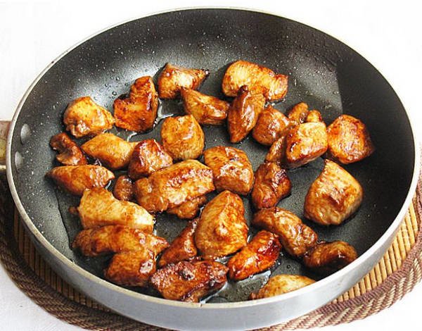 Étape 3 Faire frire la viande dans une poêle chaude dans de l'huile végétale à feu vif pendant 3 minutes. Ajoutez un peu de sauce soja, réduisez le feu et faites frire pendant encore 3-4 minutes.