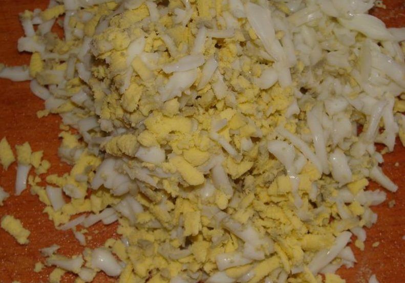 Étape 4 Faire cuire les œufs dans une coquille raide et pelée et les râper sur une râpe grossière.