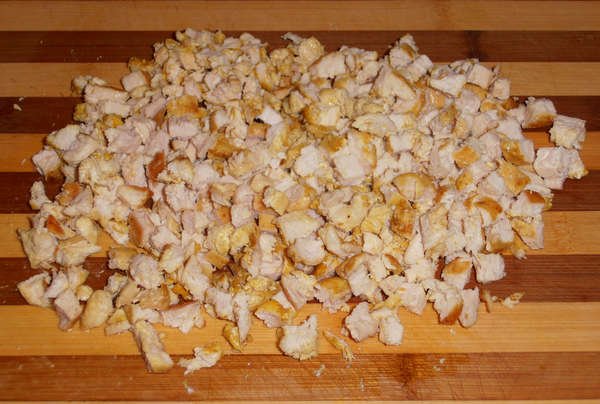 Étape 2 Préchauffez la poêle et faites revenir les poitrines de poulet dans l'huile végétale des deux côtés jusqu'à tendreté. Ensuite, couper en petits cubes.