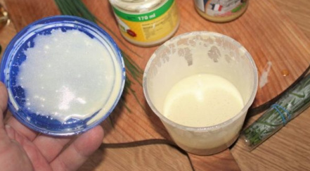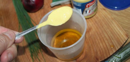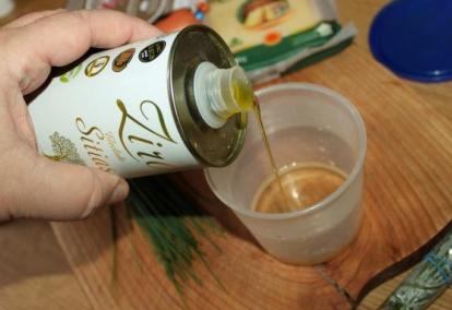 Étape 1 Vous devez d’abord préparer une vinaigrette: versez 2 cuillères à soupe d’huile d’olive et de vinaigre de vin blanc dans un petit verre.