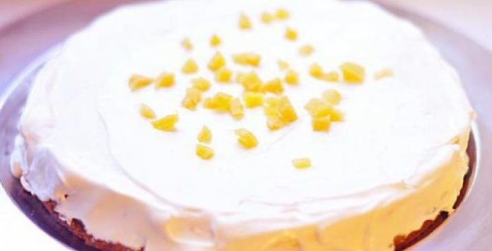 Étape 7 Mettez la masse dans un moule sur une base sablonneuse et appuyez légèrement sur la table pour éliminer l'excès d'air pénétrant dans le remplissage, sinon le gâteau au fromage fera des bulles lors de la cuisson. Placez le moule sur une plaque à pâtisserie, ajoutez de l'eau pour obtenir un bain-marie et faites-le chauffer au four à 180 degrés pendant environ 50 à 60 minutes. Ensuite, éteignez le four, mais ne sortez pas le gâteau au fromage avant une heure et demie. Après cela, sortez-le du four et laissez-le refroidir au réfrigérateur, où le gâteau au fromage devrait passer au moins 4 heures. Après cela, il peut être décoré avec un verre de crème fouettée jusqu'à obtention de pics fermes de crème et spécialement laissé pour servir à décorer des morceaux de gingembre bouilli.