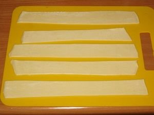 Étape 1 Décongelez la pâte et roulez-la sur une longueur de plus de 30 cm sans dépasser 3 mm. À l'aide d'un couteau tranchant, coupez la pâte en lanières de 3 à 4 cm de large.