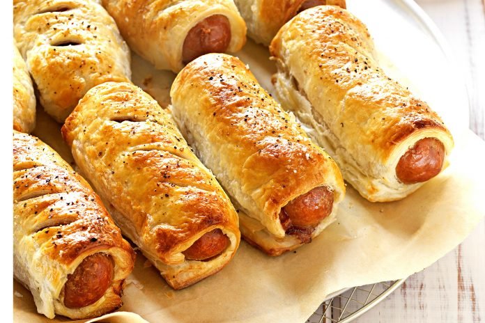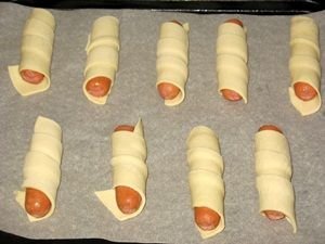 Étape 3 Saucisses enveloppées dans une pâte feuilletée, disposées sur une plaque à pâtisserie recouverte de papier sulfurisé. Graisser au jaune d'oeuf.
