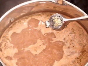 Étape 8 Pressez l'ail dans le presse-ail, retirez la casserole du feu et laissez infuser 10 à 20 minutes avec le couvercle fermé.