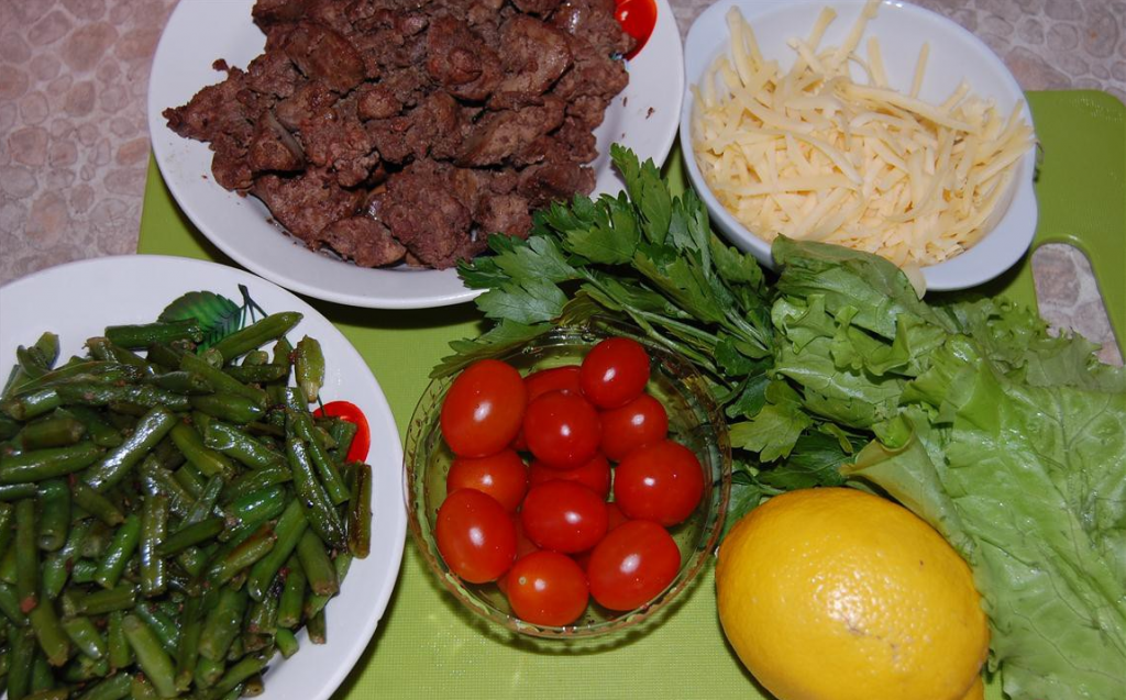 Étape 1 Rincer le foie de poulet, sécher et couper en petits morceaux. Faire frire dans une poêle, saler et poivrer. Décongeler les haricots verts, laisser mijoter dans une poêle et les faire frire légèrement. Râpez le fromage sur une râpe grossière.