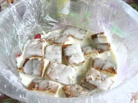 Étape 8 Ensuite, retirez le gâteau du récipient, retirez le film plastique. Couper un gâteau et servir.