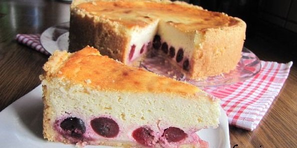 Étape 4 Divisez la pâte en deux parties, l'une plus grande que l'autre. Enroulez la majeure partie en cercle, étendez-la au bas d'une forme détachable (26 cm). À partir d’une petite partie, faites une saucisse, répartissez-la le long du bord intérieur de la forme, en formant une planche jusqu’au sommet. Versez les cerises au fond, puis étalez tout le remplissage du caillé.