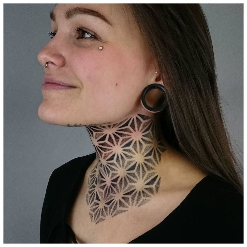 Sur le devant de la gorge, le motif ferme les soies. Les hommes se font tatouer cette partie du corps s’ils savent qu’ils vont se raser constamment. Sinon, ce tatouage ne sert à rien.