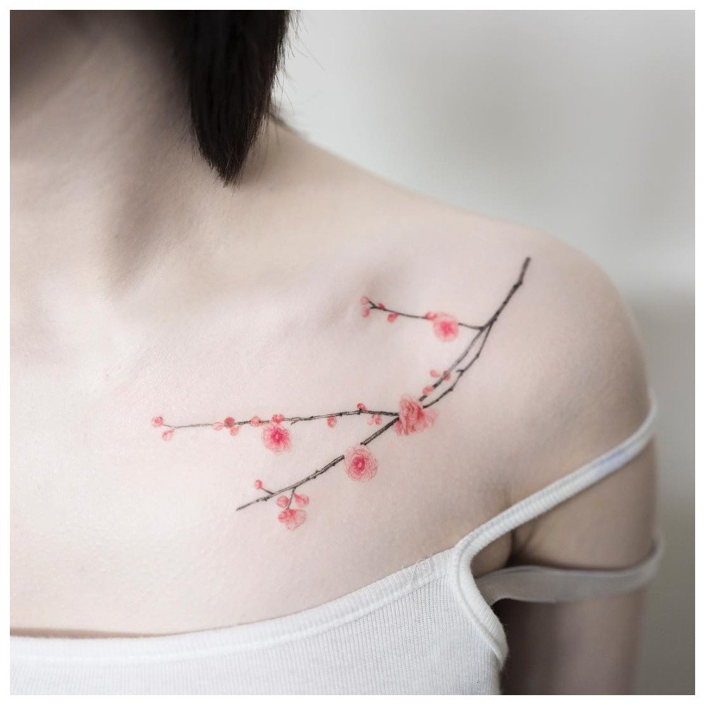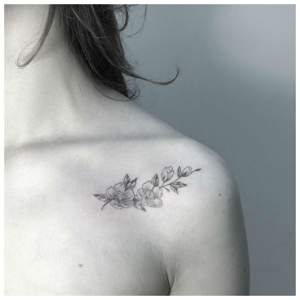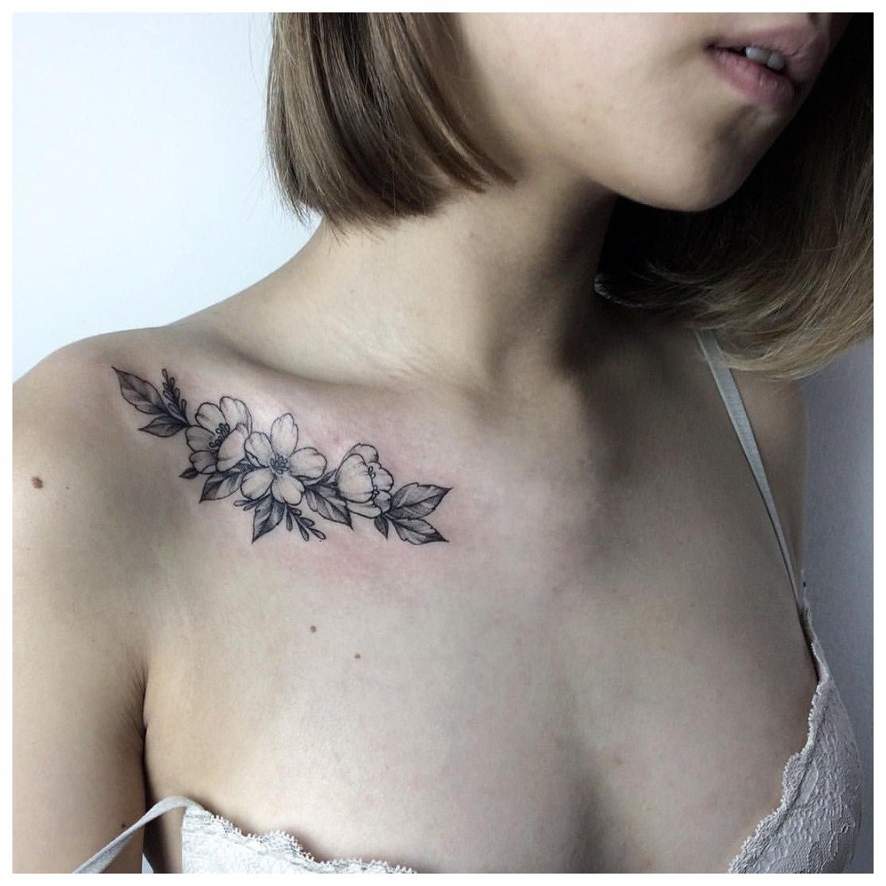 Les tatouages qui regardent le long de la clavicule dans la direction de l'épaule sont plus beaux. Il s’agit souvent d’un rameau, d’une inscription ou d’une fleur délicate. Un dessin plus grand capture généralement une partie de l'épaule, car il nécessite plus d'espace.