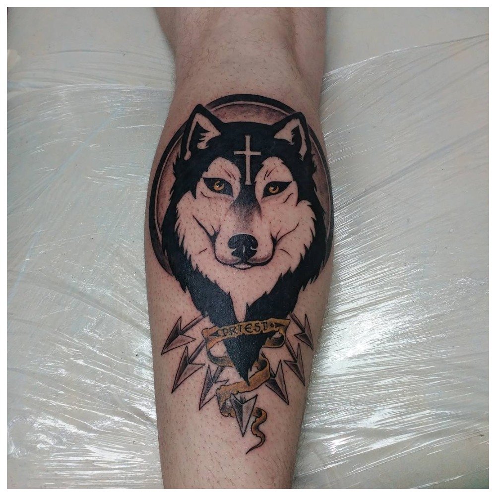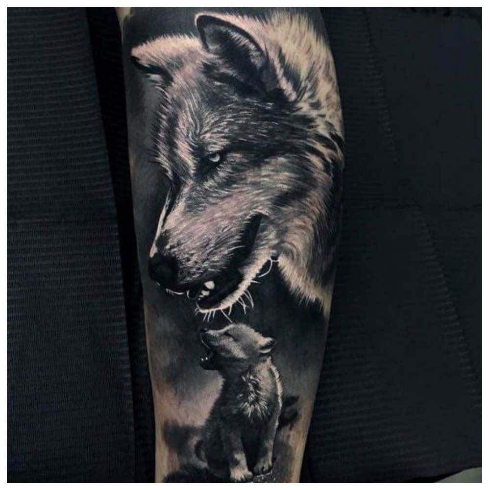 Sur le caviar, vous pouvez faire un tatouage de loup avec une louve. De tels modèles sont souvent préférés par les couples pour démontrer leur loyauté les uns envers les autres. Sur cette partie du corps dans son ensemble, tout motif sera beau - une fente palatine, un troupeau, un prédateur contre un paysage forestier, etc.