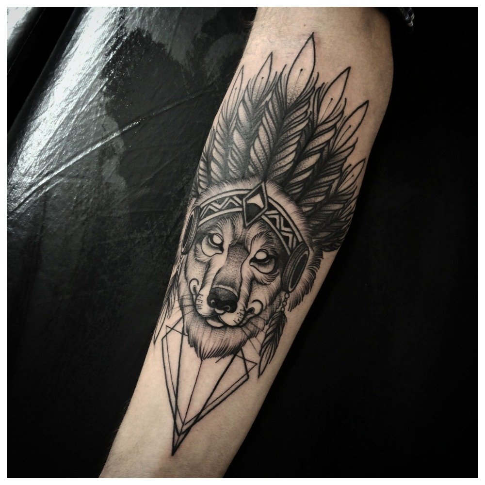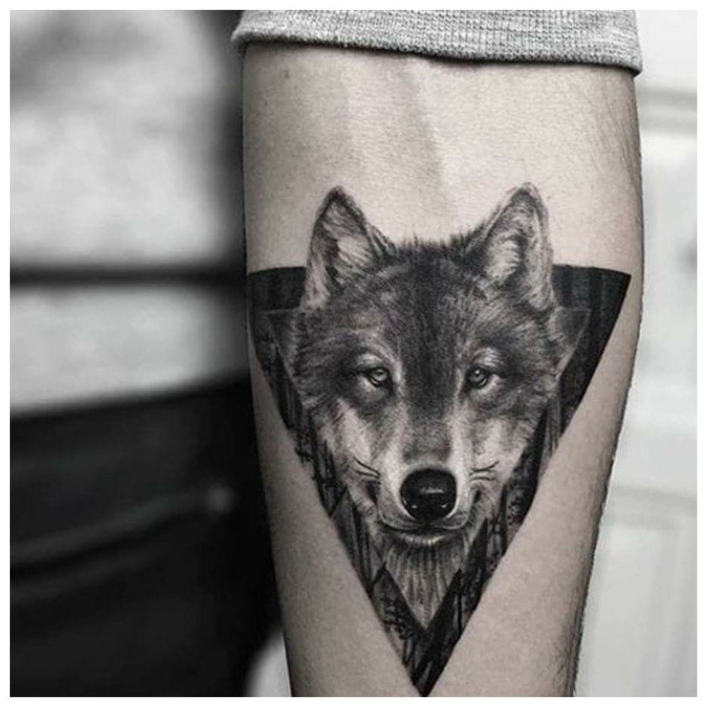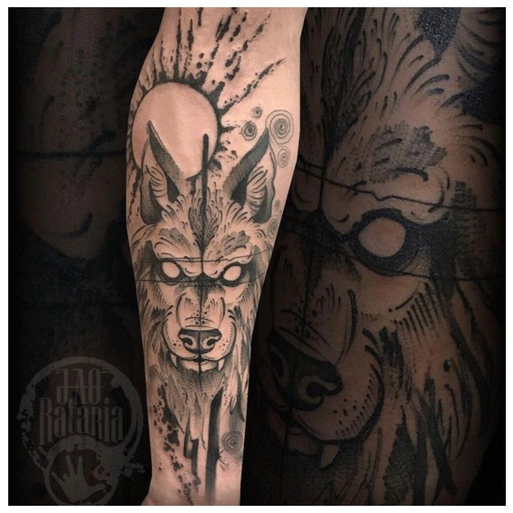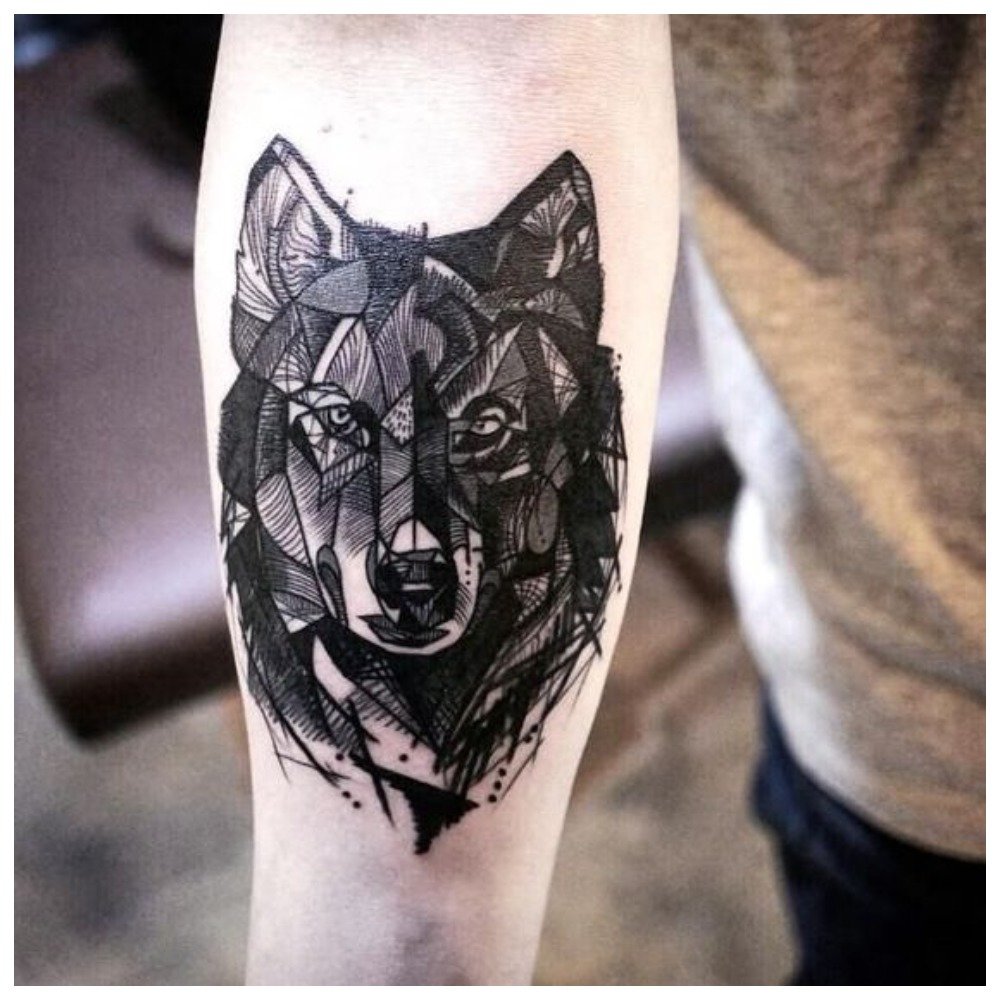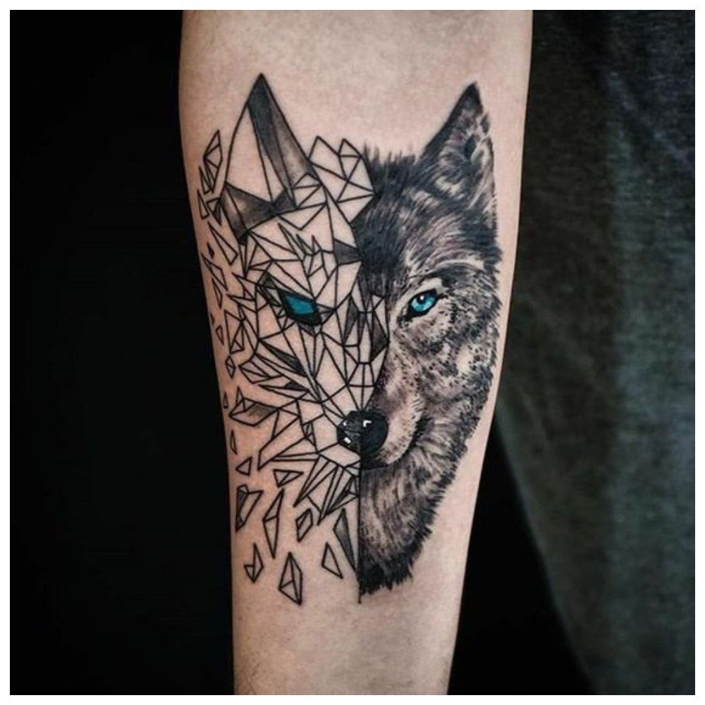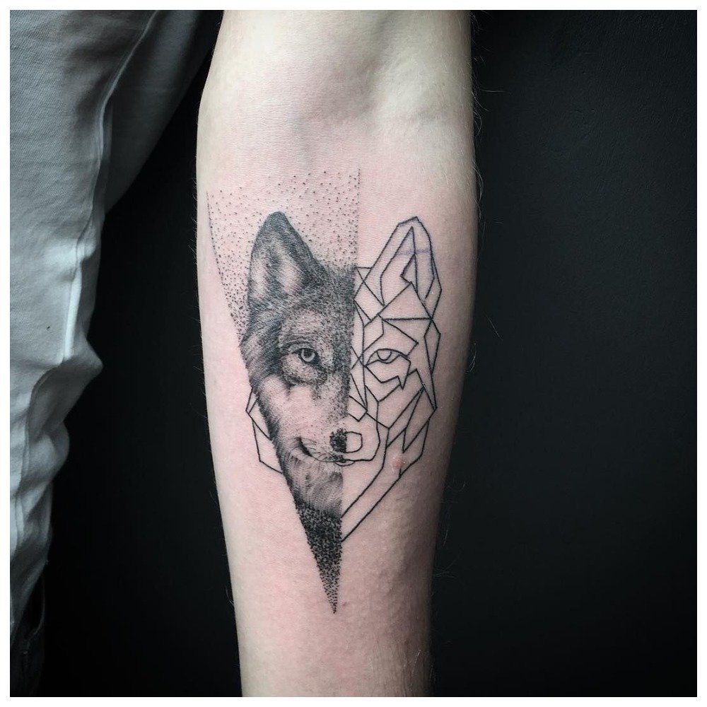 De nos jours, les tatouages de loup sont à la mode, dans lesquels deux styles sont mélangés - la géométrie et le tatouage réaliste. Une telle tête de loup est très impressionnante, fraîche et originale.