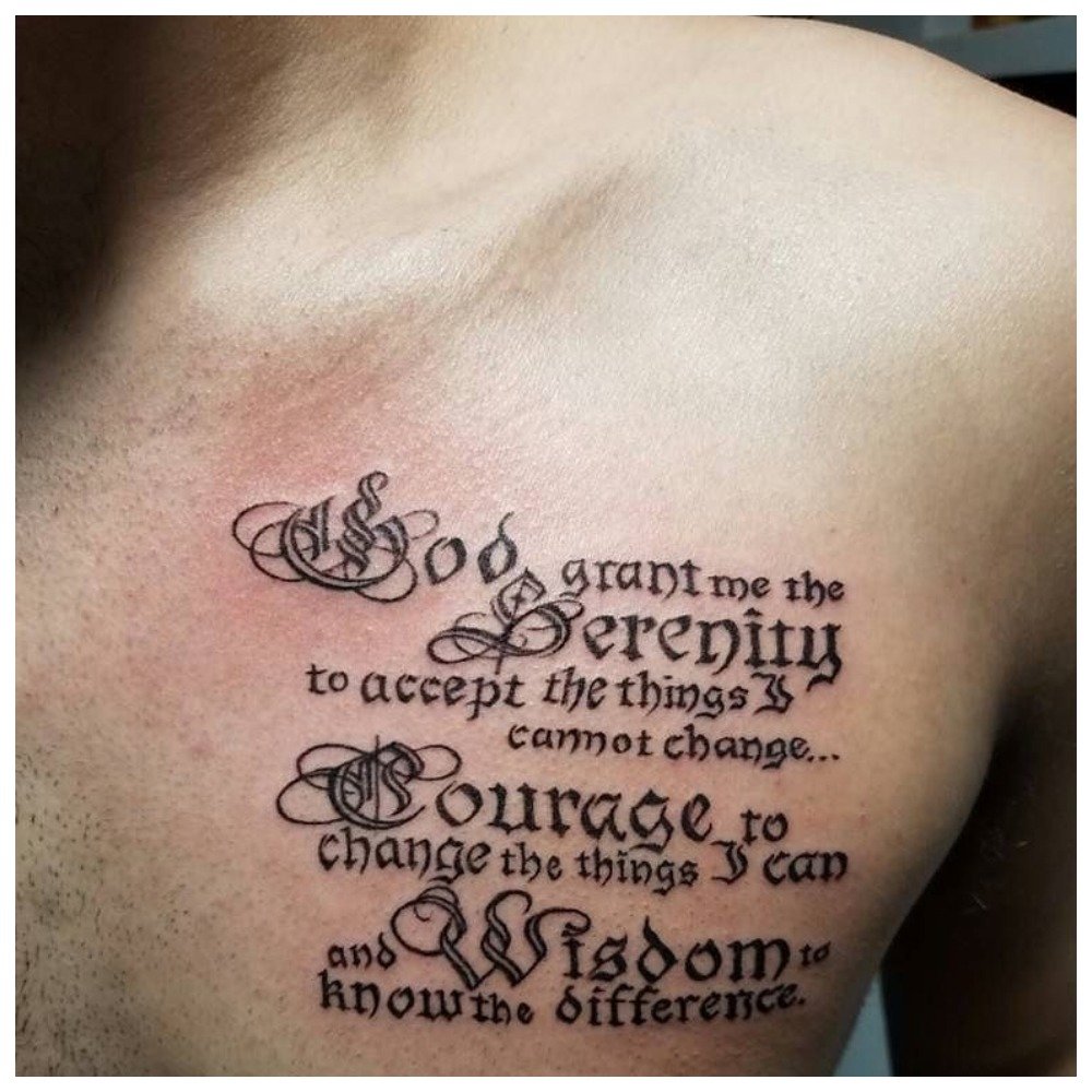 Dans un premier temps, un petit tatouage sera inscrit sur la poitrine d'un homme. Cela peut être une citation importante, un slogan, le nom de votre bien-aimé. De plus, il n'est pas nécessaire que la citation soit dans une langue que tout le monde comprend. Cela peut être latin. Dans ce cas, l’accent est mis sur la beauté du dessin du tatouage et non sur la signification.
