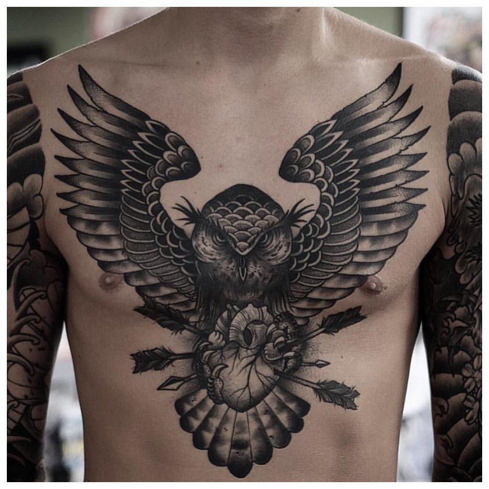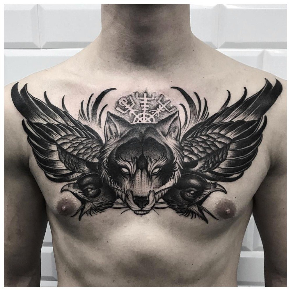 Bien entendu, les tatouages d’animaux sont le modèle le plus courant de tatouage de sternum masculin. Loup, lion, oiseaux - tout cela est le bienvenu et ne se démode pas.