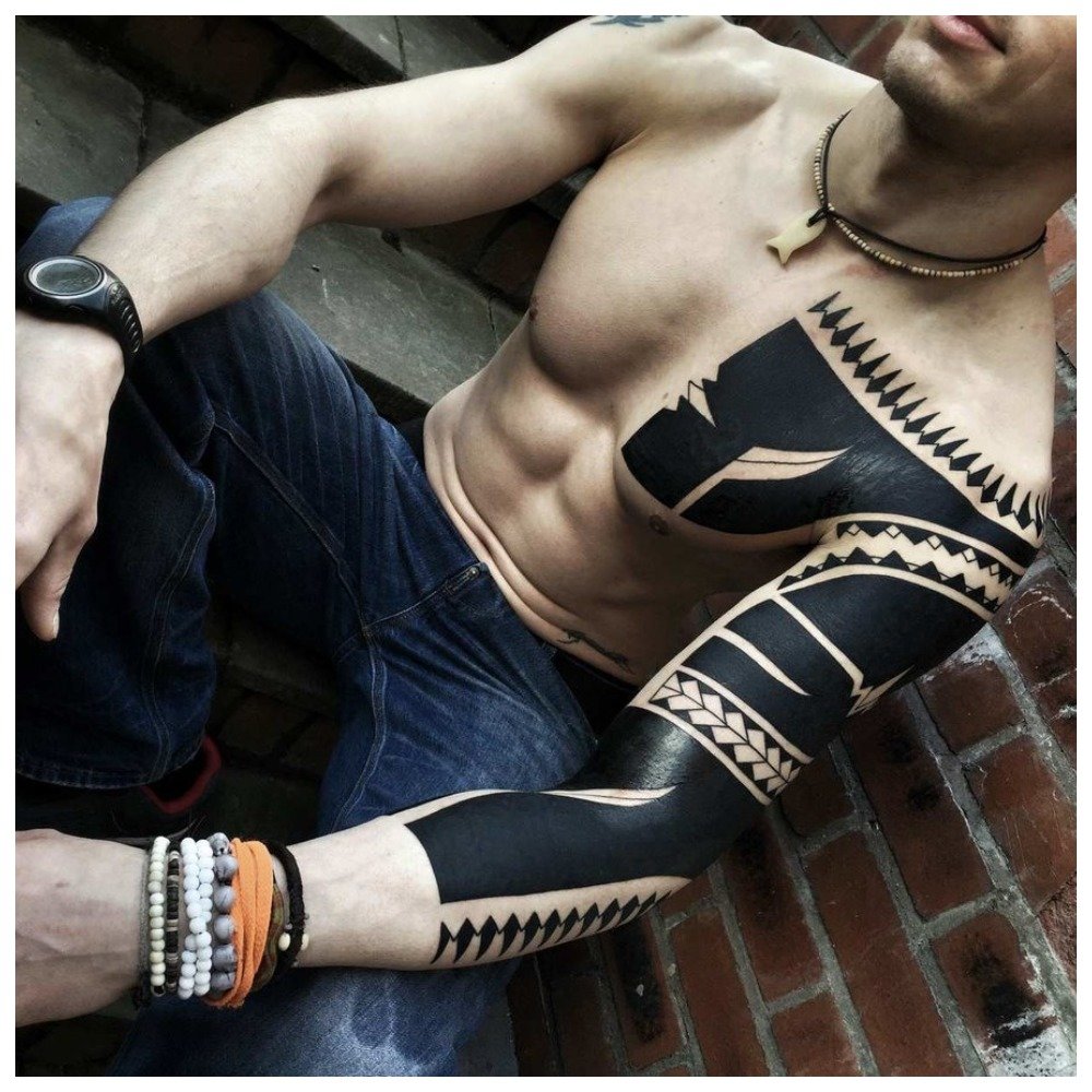 Les tatouages en noir peuvent être très minimalistes et à très grande échelle. Dans certains cas, l’accent est mis sur la peau, c’est-à-dire que toutes les zones inutiles sont obstruées par de la peinture noire et que le contour est un teint naturel. Il est à noter que cette option n’est plus à la mode. Néanmoins, l'accent est mis sur le minimalisme.