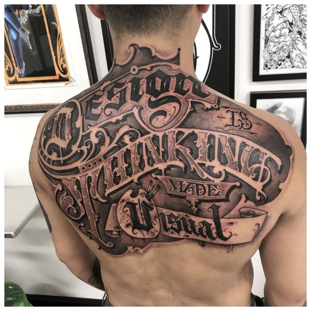Le lettrage est une inscription stylisée appliquée au corps dans différentes polices. En règle générale, ces tatouages sont des inscriptions beaucoup plus classiques. Créer une police pour un tatouage est un art et un processus très long.