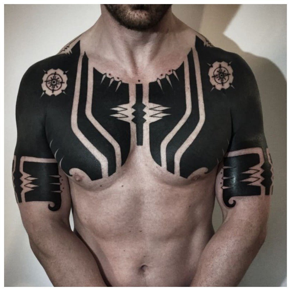 Ne confondez pas tribal avec des lignes. Cette technique est réalisée avec des lignes larges, tissant dans un ornement qui ressemble au style de dessin des tribus mayas. C'est de ce style que sont nées les tendances du tatouage telles qu'ethno et linwork.