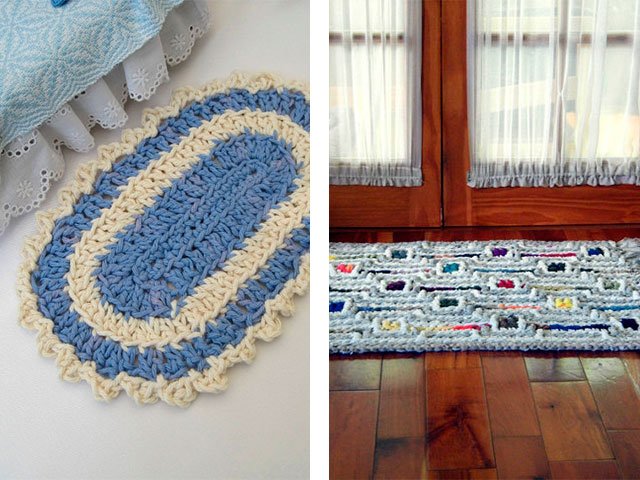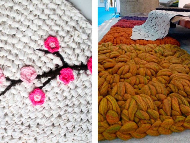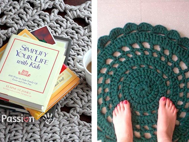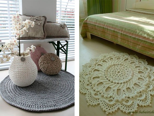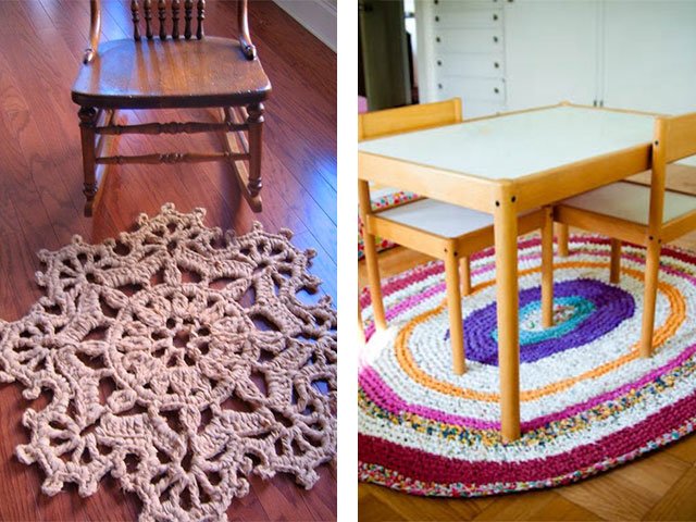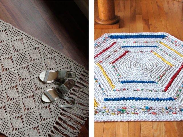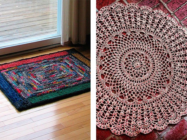 Comme nous l'avons écrit plus haut, le tapis peut être tricoté absolument de tout matériau, que ce soit un modèle de vieilles choses (T-shirts), à partir de sacs en plastique (de cellophane et de déchets) ou de fil ordinaire. Toute option sera belle dans votre maison sur le sol ou sur une chaise. Souvent, en plus des tapis, pour la décoration intérieure et les chambres créent de belles plaids de lambeaux de tissu, une couverture sur un tabouret, coussins multicolores de carrés tricotés avec aiguilles ou crochet, serviettes de table originales pour meubles ou sous vases de tasses en tricot pour plus de confort. Grande excitation autour des produits de fil tricoté - les modèles sont très «faits maison» et inhabituels.