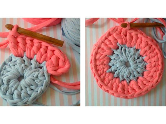 Pour commencer couper de vieux t-shirts en ficelles. Il est préférable de faire cela avec une spirale continue, de sorte que moins de nœuds doivent être noués. Après cela, vous devez prendre un crochet large et épais et commencer à gagner des boucles. Comme si vous les composiez en utilisant un fil normal. Fermer V.P. dans une chaîne et coudre l'articulation pour la force. Le modèle de tricot est attaché ci-dessous. En l’utilisant avec un fil simple, vous pouvez tricoter un tapis rond.