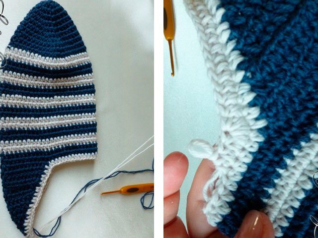 Dans notre exemple, la finition est composée de motifs en patchwork et, à la fin, le bord est également noué de deux rangées de tiges de jonction avec un fil bleu. Les motifs sont attachés au chausson en train de nouer le bord.