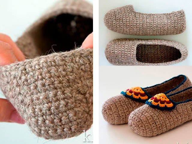 Nous continuons à bien tricoter le talon de la même manière, en attachant des boucles à partir des parties latérales. Terminez de tricoter le talon avec la rangée avant. Le résultat est un talon soigné. Maintenant, nous attachons le bord du chausson (à l’exception du talon) avec des colonnes à crochet simple, en tirant légèrement le bord pour un meilleur ajustement du pied. Ensuite, nous tricotons une rangée de poteaux de jonction le long du bord, y compris le talon. Coupez le fil et cachez son extrémité. Slipper est prêt. Nous avons tricoté le deuxième de la même manière.