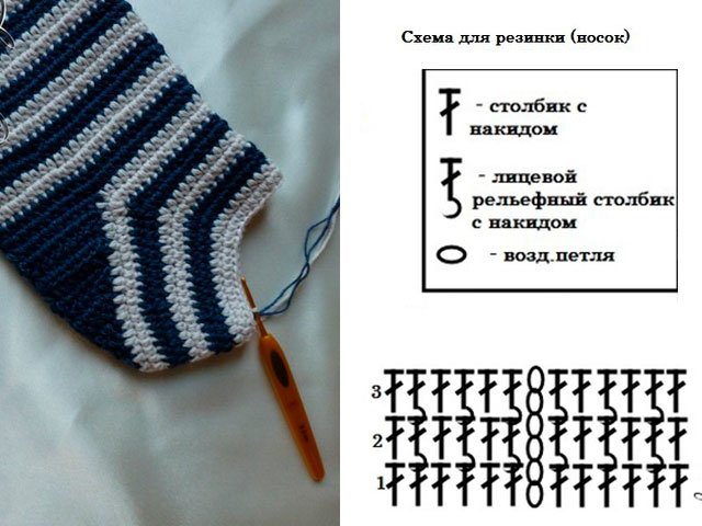 Nous tricotons le haut des bottillons au crochet en rangs rotatifs. Nous avons tricoté la première rangée avec les colonnes gaufrées au dos (au travail) sans crochet pour la formation d’un passepoil. Pour le levage, nous tricotons une boucle d’air.