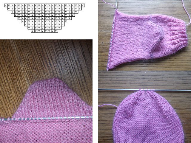 Par exemple, nous prenons 48 boucles, nous les tricotons + 2 ourlets (50 boucles au total) sur 2 aiguilles à tricoter, nous tricotons un tissu droit avec 5-6 cm d'élastique, puis avec point avant ou le motif choisi 7-8 cm. Nous commençons à tricoter le talon: le nombre de boucles (sans ourlet) diviser en 4 parties, il en résulte 12 boucles. Nous allons tricoter le talon sur les deux parties centrales. Nous tricotons les 12 + 12 + 12 boucles avant (trois pièces), retournons le travail et tricotons 12 + 12 boucles (deux parties centrales). Encore une fois, retournez le travail et tricotez 12 + 11 boucles.