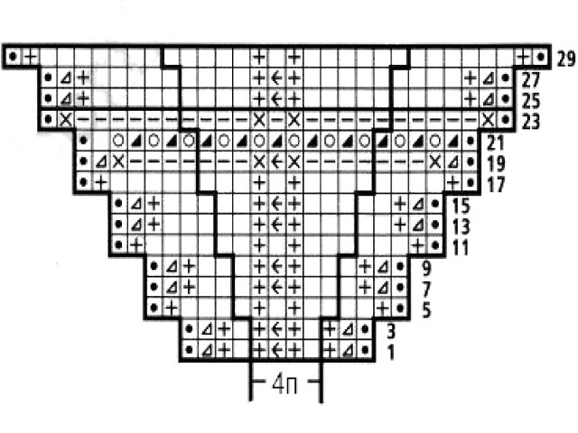 Voyons comment connecter le modèle de base de notre châle. Nous tricotons selon le schéma. Dans le diagramme, toutes les lignes (p.) Sont faciales (personnes). Dans le mauvais (out) p. nous tricotons des boucles (p.) selon la figure, du fil (n.) que nous tricotons, etc. (boucles intérieures). Nous avons tricoté * 6 fois du premier au 24e rang, nous ajoutons (p.) Le même principe (voir du 25e au 29e rang) pour seulement 144 p.
