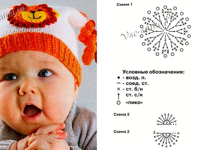 Bien sûr, vous ne pouvez pas décorer un chapeau pour un nouveau-né applique de lionceaumais nous vous dirons quand même comment le faire. S / X 1 tricoter une petite tête orange fil dont le dernier R. est marron. Jaune colorer l'oreille droite et gauche (C / X 2). La tête presque prêt - il reste à attacher le museau. Il est facile de tricoter selon le schéma 3. Toutes les pièces sont connectées en un seul dessin, vous pouvez ajuster la taille vous-même. Pour les bébés - La meilleure option avec un élastique et un personnage amusant. Votre enfant va définitivement tomber en amour avec un tel chapeau! Vous pouvez également crocheter un chapeau pour un nouveau-né, mais avec des aiguilles à tricoter, il sera plus dense et chaud.
