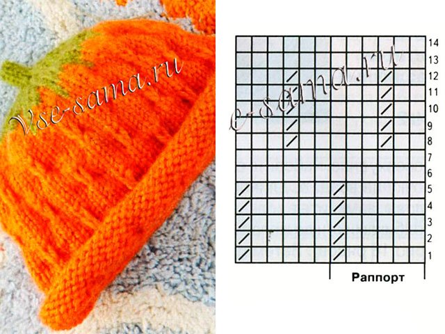 - Bonnet tricoté avec des aiguilles à tricoter pour un nouveau-né ou un bébé de deux mois: bonnet d'après la photo - baie! La couleur principale du produit est orange. Il faudra un peu plus de vert ou de vert clair pour les "boutures".