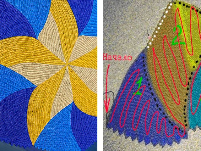 Beau tapis dans le diamètre de 124 centimètres. Parce que ce sera accessoire arc-en-ciel - Nous prenons 8 écheveaux de fil de différentes couleurs. Aiguilles à anneau 3 mm, vous pouvez d’abord utiliser la bonneterie. Mais cette option est seulement pour la commodité.