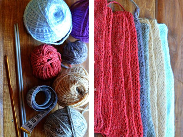 Une très bonne option est aussi pour ceux qui ont des fils supplémentaires à gauche. Vous devez connecter 10 pièces - des rectangles de 5 * 25 cm.Cette option est toujours utile car elle peut être créée avec un crochet ou avec des aiguilles à tricoter.