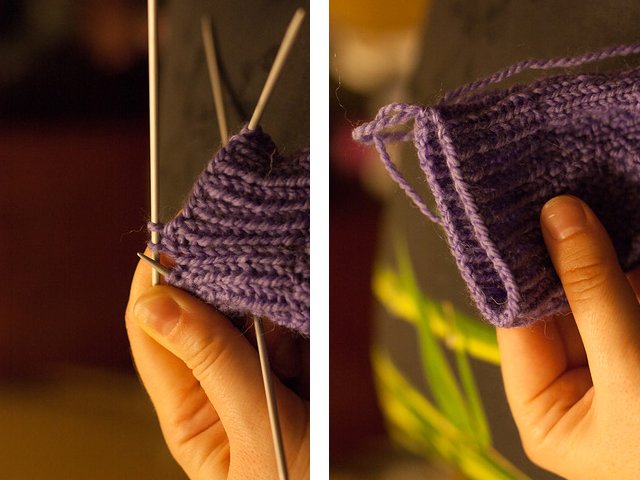 Nous collectionnons les boucles et commençons à tricoter avec 1 x 1 gomme sur environ 5 cm (1 pb x 1 ip). Répartissez uniformément les points de suture sur 4 m.