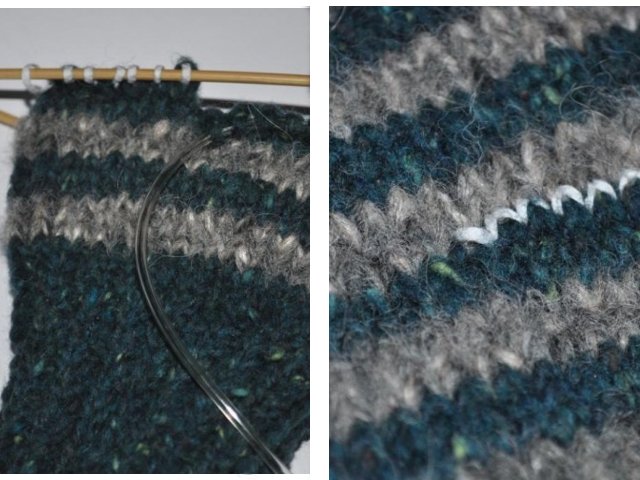 Après l'élastique, nous ajoutons 5 points à la ligne en changeant alternativement les couleurs du fil. Après 14 heures à partir de la gomme, nous faisons un trou pour le doigt. A l'arrière nous avons tricoté 22 CV Nous avons tricoté 7 CV et les avons rejetés. Ensuite, nous faisons la partie principale jusqu'à la fin. À la fin, nous réduisons les boucles et fermons le tricot.