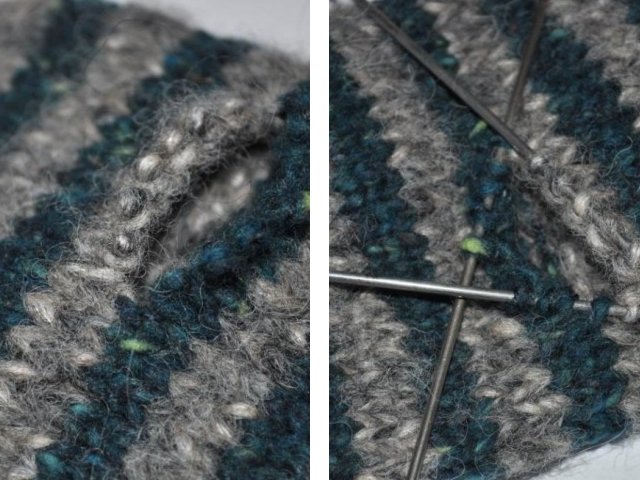 Nous allons faire un trou dans la première joint-venture. pour les mitaines de droite et le 2 pour la gauche. Nous tricotons le 1. Pour le 1 er, tricoter le reste avec soin du visage et revenir à la première m. Nous devrions donc avoir un trou. Ensuite, nous tricotons en cercle jusqu'à la fin du tricot (8 cm).