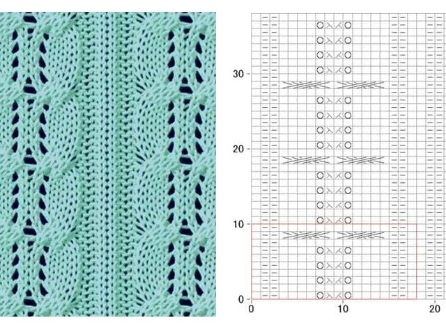 1. Tresses ajourées. Le rapport de motif dans le diagramme est indiqué par un rectangle rouge. Le nombre de lignes dans le rapport est de 10, les boucles sont de 18. Les cellules vides sont faciales. Dans la mauvaise rivière. rendre les boucles avant mal.