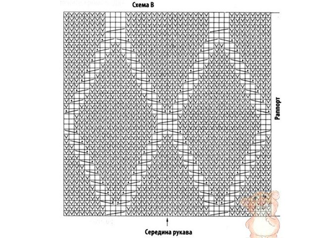 Avec les aiguilles à tricoter N ° 6, composer le numéro 42 p., Tricoter 5 cm en lignes droites et inversées avec un élastique 1 x 1, comme pour le dos. Dans le dernier out. row réduit uniformément le nombre de boucles à 42. Ensuite, remplacez les aiguilles à tricoter par le numéro 7 et tricotez avec un motif en relief selon le schéma B, en calculant le début du motif (le milieu du motif est indiqué par une flèche).