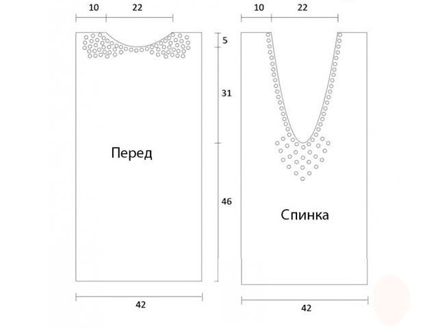Dossier: Commencez comme avant. À une hauteur de 46 cm, commencez à pratiquer une incision au dos. Laissez les 6 points centraux non tricotés, finissez les côtés séparément. Réduire simultanément 2 boucles de chaque côté du cou - 10 fois et 1 boucle - 18 fois. À une hauteur de 82 cm Terminez le travail.