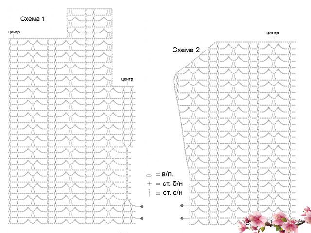 Avant et arrière: composer 138 v / p dans la chaîne.Tricoter en rangées d'avant en arrière. Tricoter avec des tables au crochet dans chaque boucle - 1 rangée. Tricotez ensuite selon le schéma 1, en répétant le rapport entre * - * - 16 fois. Après 14 cm, répartissez l'ouvrage à l'envers à l'avant et aux emmanchures comme suit: Tricotez 2 rapports entre * - *, 28 pb, sautez 4 rapports entre * - *, faites une trace. 4 rapports entre * - *, 28 pb, sauter 4 rapports entre * - *, tricoter 2 rapports entre * - * = couper au dos. Continuer à tricoter selon le motif 1. À 36 cm de hauteur, mettre de côté.