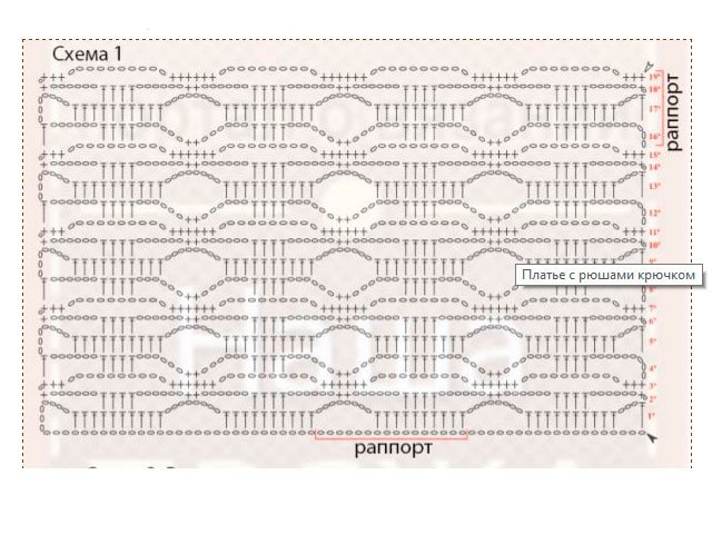 Avant et arrière:fil blanc Cléa 5 et crochet 1,5 mm. composez une chaîne de boucles d’air de 80 cm de long, reliées à l’anneau par une colonne de liaison. Tricotez avec un motif suivant le schéma 1. À une hauteur de 60 cm, divisez l'ouvrage en deux et terminez le dos et séparément avant les rangées.