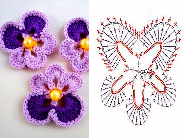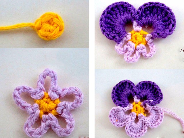 Pour les vêtements, nous proposons de faire une belle broche de connexes pensées de fil violet foncé et lilas. Encore besoin d'un peu de jaune pour le milieu de la fleur. Donc, on prend le crochet au numéro 2. On fait un anneau à partir de VP, puis on tricote selon le schéma.